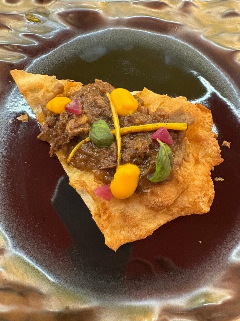 Chiusura con la RadiCE di Genovese, impasto in 3 cotture con genovese in crema con mela cotta, carne di bufalo, carota e cipollotto marinato alla soia e poi cotto al barbecue, crema di carote e basilico viola, una rivisitazione di un classico molto amato dal nonno.