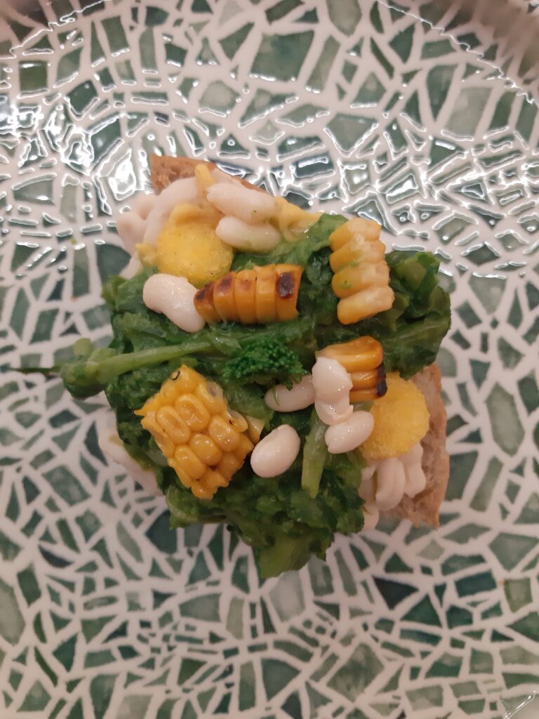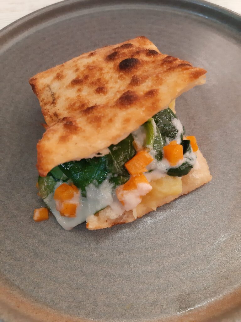 Proseguiamo con la Merenda della SuoCEra – impasto classico con crema di topinambur, spinaci, spinacino croccante, patate gialle sotto cenere e brunoise di patate dolci – che non ha bisogno di interpretazione.