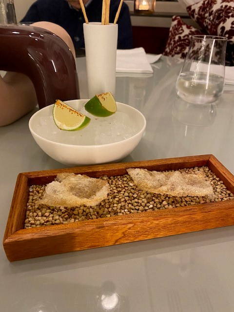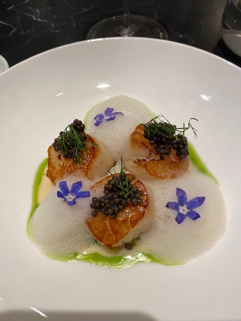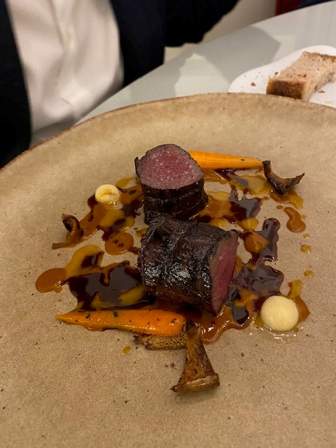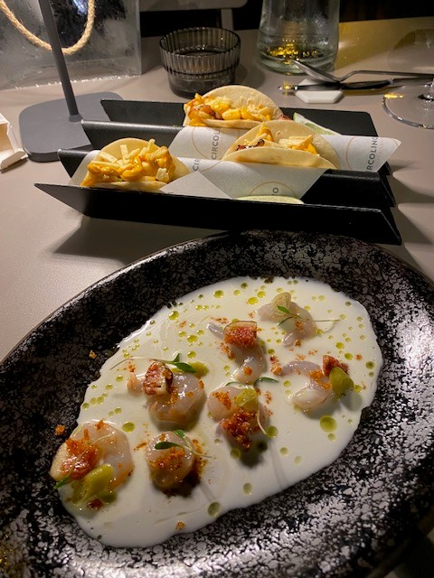 Di seguito alcune pietanze proposte nel menù: presa Ibérica alla brace, finferli, albicocca e mojo rojo (un’espressione culinaria che combina ingredienti spagnoli e italiani in un’armonia di sapori. La presa iberica è un taglio di carne di maiale pregiato proveniente dai maiali iberici, noto per la sua tenerezza e il sapore ricco. L’accostamento con i finferli e l’albicocca crea un interessante contrasto con il salato della carne); ravioli di baccalà mantecato (un piatto interessante che unisce sapori tradizionali e innovativi. La farcitura di baccalà mantecato, cremosa e saporita, viene abbinata a una salsa di curry rosso, che aggiunge una nota speziata e aromatica. Le cozze, con il loro sapore di mare, arricchiscono ulteriormente il piatto, mentre il peperone crusco, tipico della cucina meridionale, aggiunge un tocco croccante e un sapore affumicato); torrija, mango, zafferano e yogurt (una ricetta che combina la dolcezza delle torrijas, la freschezza del mango, l’aroma unico dello zafferano e la cremosità dello yogurt, creando un dessert bello da vedere e delizioso da gustare).