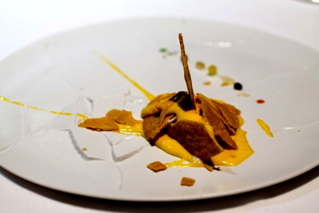 Pane e pomodoro della Campania, passando alla zuppa di pesce dell’Adriatico, direttamente dalla Laguna di Venezia, con cottura in forno a vapore di cozze, cannolicchi, granchio blu, vongole, gamberi rossi ed erbe aromatiche. Si fa un salto in Sardegna con il risotto all’astice blu, fondo di branzino e agrumi e si torna in Costiera Amalfitana con brodetto di olive verdi capperi e colatura d’alici. Come dessert l’immancabile “Ooop, mi è caduta la crostata” dello chef, uno dei suoi piatti più celebri.
