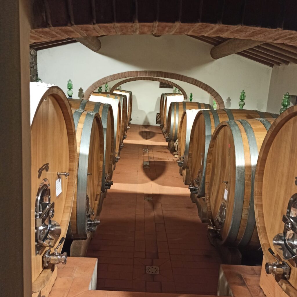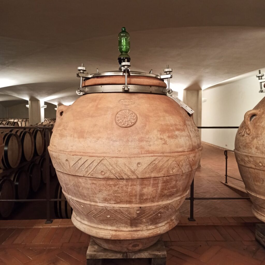 Un discorso a parte meritano le anfore d’argilla presenti in cantina, tutte fatte a mano da un artigiano locale. La manodopera di ciascun pezzo richiede tre mesi di lavoro, tra modellazione dell’argilla, essiccazione, cottura e lisciatura finale- interna ed esterna- con pelli di daino, per ridurne al minimo la porosità. Vengono utilizzate per una selezione di acini di Sangiovese che vi rimangono in fermentazione, macerazione e maturazione per nove mesi consecutivi. Successivamente alla pressatura, il vino è nuovamente posto in anfora per sette mesi. Il prodotto che se ne ottiene viene miscelato, nella misura di circa il 2%, al vino maturato in barrique atto a divenire Flaccianello. Una sorta di liqueur d’expedition, lo definisce Silvano. A tutti gli effetti una firma che denota lo stile della cantina e serve ad esaltare il frutto del Sangiovese in finezza ed eleganza.