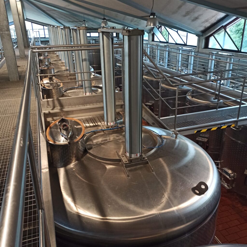 La cantina è nata in due tempi a partire dal 1997. I locali si dislocano su tre livelli (vinificazione, maturazione, imbottigliamento) per avvalersi della sola forza di gravità, al fine di evitare ogni tipo di stress all’uva, la cui raccolta, in periodo di vendemmia, è esclusivamente manuale. Prima di avviare la fermentazione, l’uva viene selezionata a mano e diraspata. I silos in acciaio e i tini tronco-conici, per una capacità totale di 5000 ettolitri, sono utilizzati per vinificare separatamente le varie vigne: la fermentazione con macerazione è avviata da lieviti indigeni e dura dalle 4 alle 5 settimane, con controllo della temperatura.
