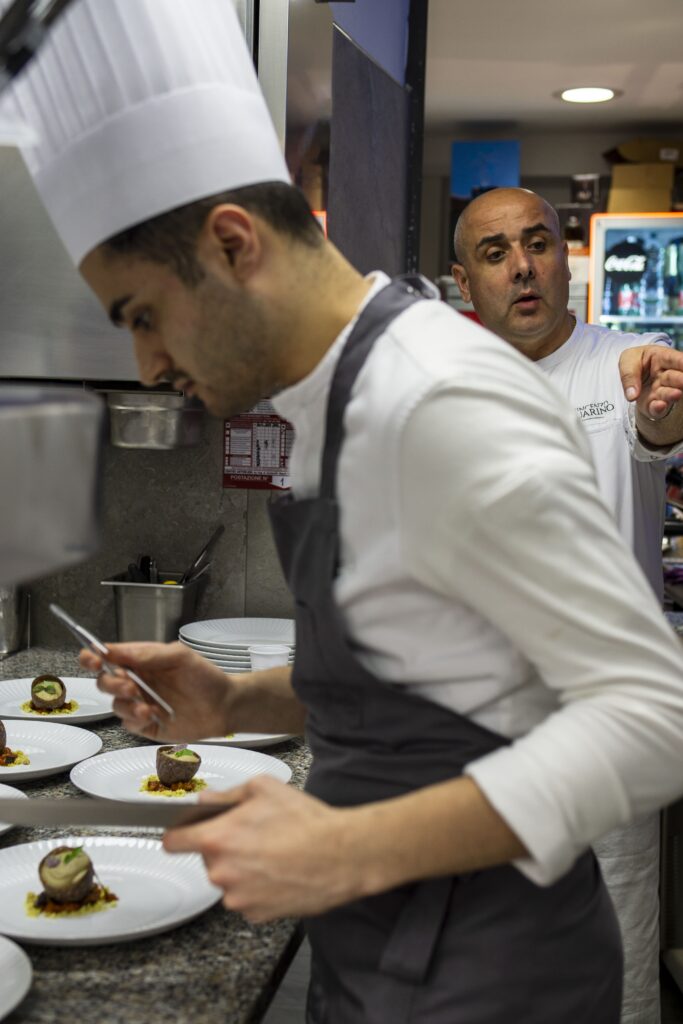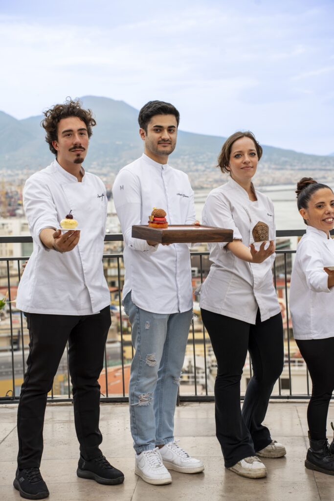 Angelo, 23 anni compiuti da poco, vanta già una gavetta di tutto rispetto che lo ha riportato a casa in famiglia, per continuare il percorso di formazione nel campo della pasticceria e dei lievitati in team con il sous chef Antonio Della Monica che si occupa anche della panificazione. L’amore iniziale per il salato – in particolare nella partita degli antipasti – e poi la virata verso i dessert e le coccole di fine pasto narrano di un giovane talento disposto al sacrificio, alla passione per il mestiere e alla irrefrenabile voglia di crescere.