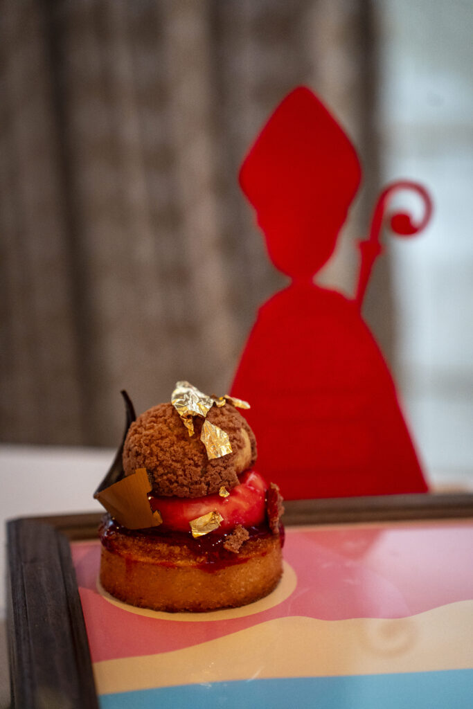 «Il dolce è una tartelletta di pasta frolla, con lamponi e crema di mandorle, mousse di yogurt glassato al lampone, bigné con cremoso al té matcha e craquelin al cioccolato. L’abbiamo studiato e realizzato in un mese di prove, per renderlo equilibrato e mai stucchevole, con quel tocco rinfrescante finale dato dal cremoso al tè matcha».