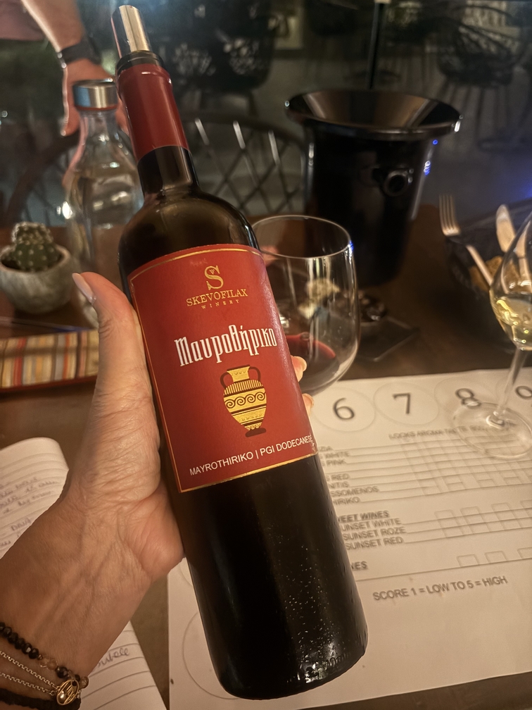 Tra i rossi, il Mavrothiriko 2023 porta in bottiglia un vitigno recuperato dalla vicina Nysiros: fruttato, con acidità vibrante e un legno ben dosato. Il Karidies Red 2020, Syrah affinato in rovere, gioca invece su prugna, pepe e tabacco. Chiude la gamma Kores, un vino dolce da Assyrtiko e Syrah, complesso e avvolgente, con note di frutta secca e spezie.