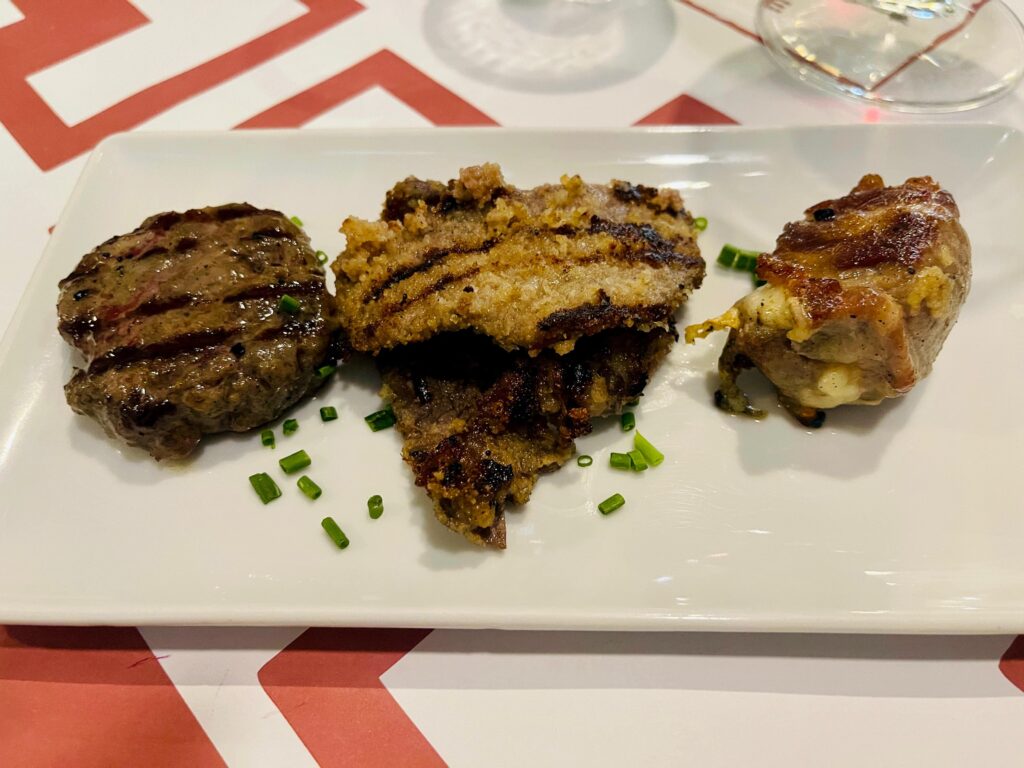 - un tris di carne alla piastra composto da: un succulento hamburger, una cotoletta palermitana di bovino impanata senza uova, con pecorino, pepe e aromi, non fritta ma alla brace, in dialetto palermitano detta “l’Appanata “, assaggiata per la prima volta è stata una piacevole e gustosa sorpresa; la “Bombetta” pugliese, un gustosissimo involtino di capocollo di maiale cotto tradizionalmente alla brace e leggermente napoletanizzato nel ripieno da Donatella, e la cui ridotta sua dimensione permette di mangiarlo in pochi morsi, io in due.