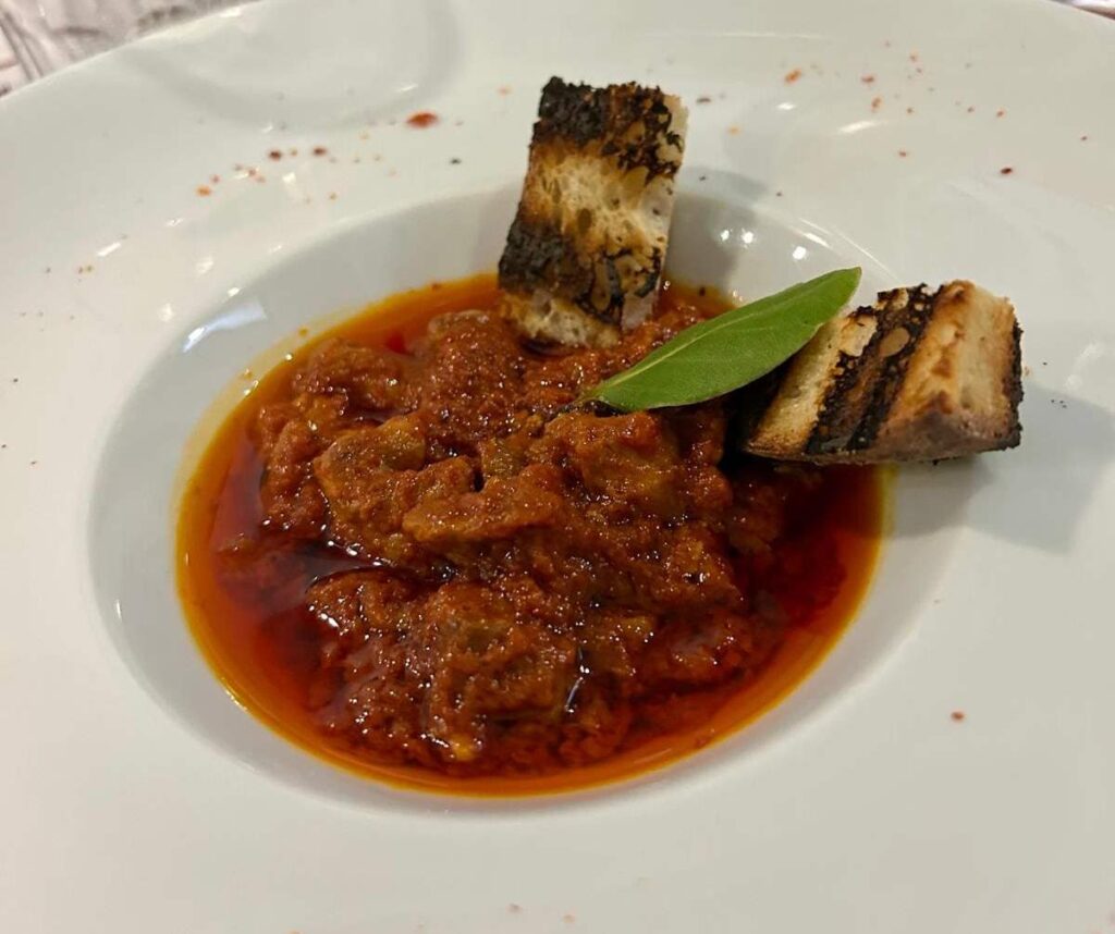 - il “Soffritto rivisitato”, ideato per quelli come me che ad oggi, nella sua versione tradizionale, non lo avevano mai assaggiato, ma cucinato senza interiora e con solo carne; in abbinamento un calice di Susumaniello del Salento, la cui leggera morbidezza ha equilibrato la leggera piccantezza, a dimostrazione che è possibile usufruire anche di una buona carta dei vini e, per chi volesse, anche la possibilità di bere birra alla spina e artigianale;