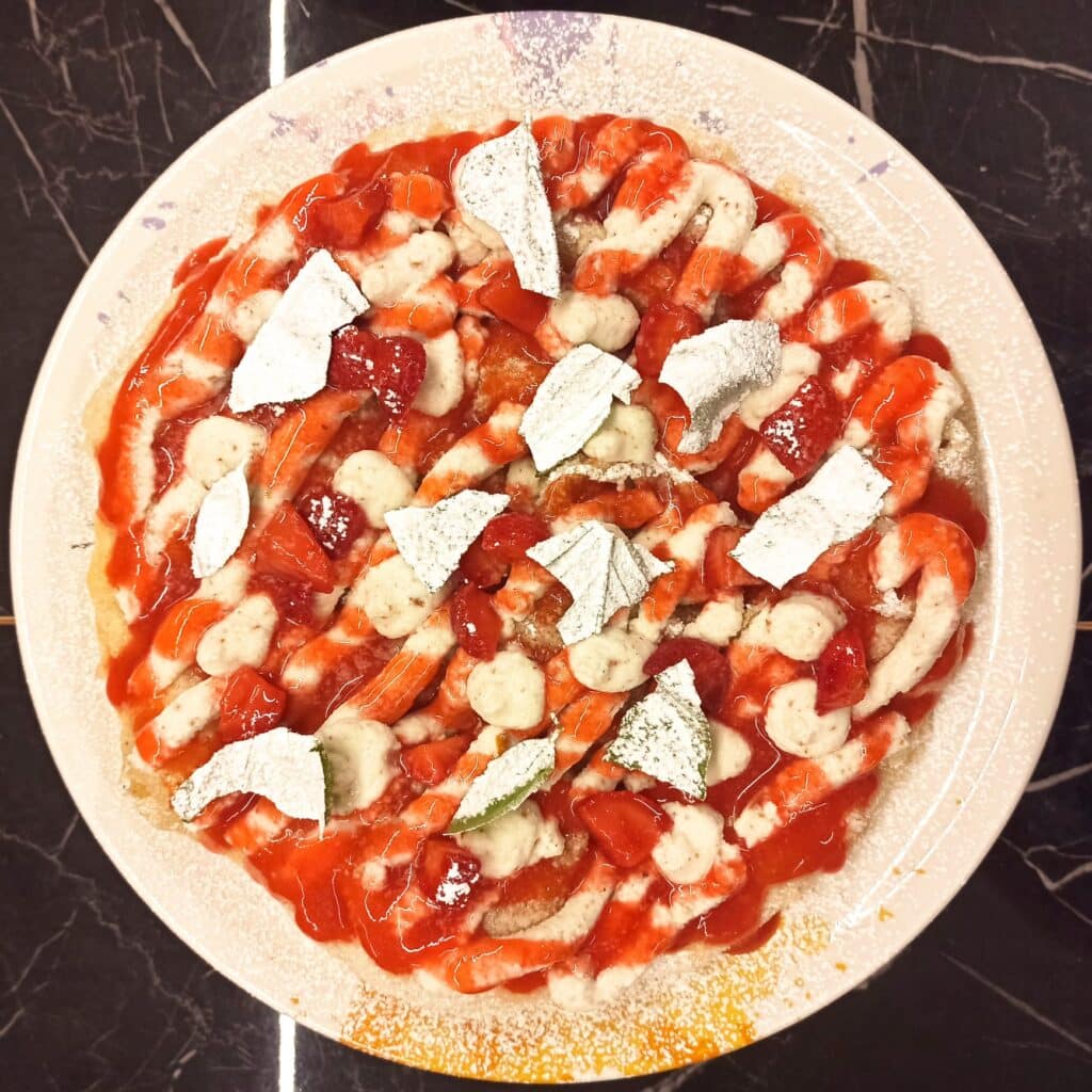 Chiudiamo la degustazione con una pizza dolce e golosa, Innesto di Margherita. La pasta viene fritta e asciugata al forno. Successivamente caramellata e farcita con fragole di diverse consistenze, ricotta di bufala lavorata con mandorle Armellina, dal particolare retrogusto amaricante, e un ultimo tocco di zucchero a velo e basilico.
