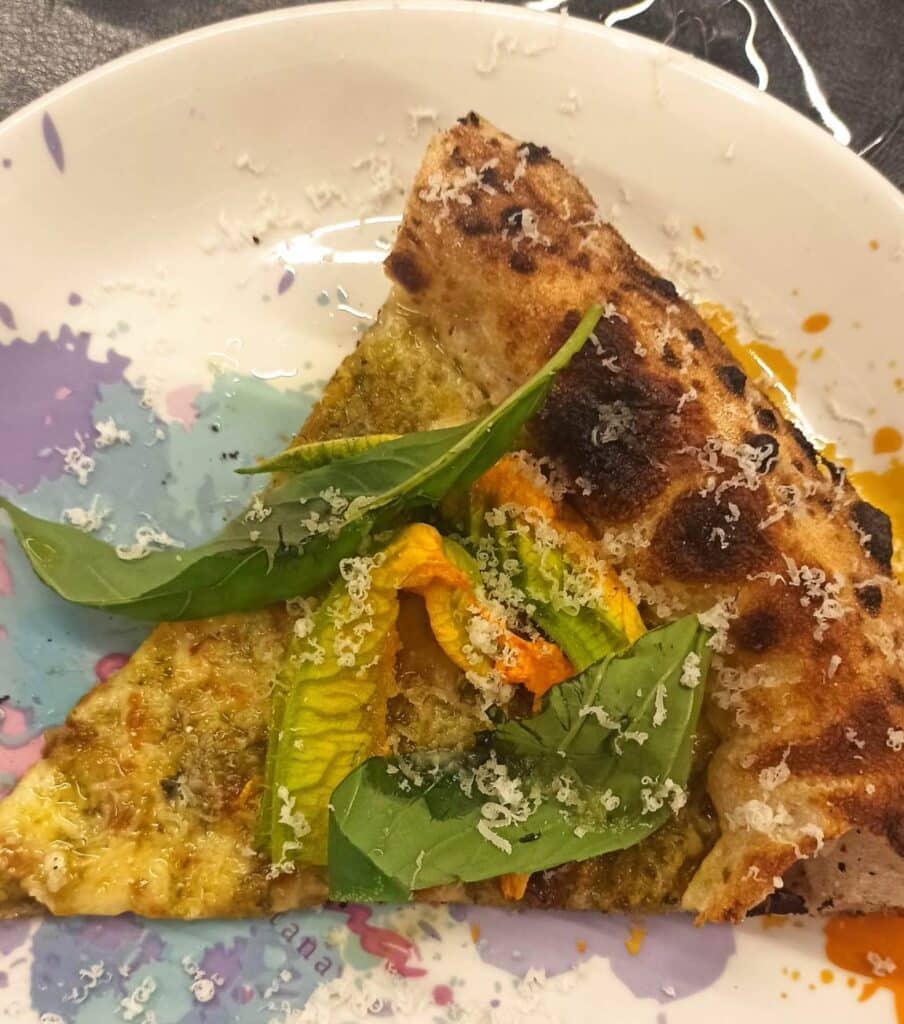 Iniziamo con la Quattro Passi a Nerano, omaggio all’omonimo ristorante tre Stelle Michelin della famiglia Mellino, che della Nerano hanno fatto uno dei loro cavalli di battaglia. Non la classica crema di zucchine a farcire l’impasto ottenuto da un mix di farina 0 e 1 rustico e gustoso. La zucchina, invece, in tutte le sue parti – frutto, fiore e pistillo – viene cotta a bassa temperatura, successivamente lavorata e condita con provola e parmigiano reggiano 40 mesi da vacche rosse.