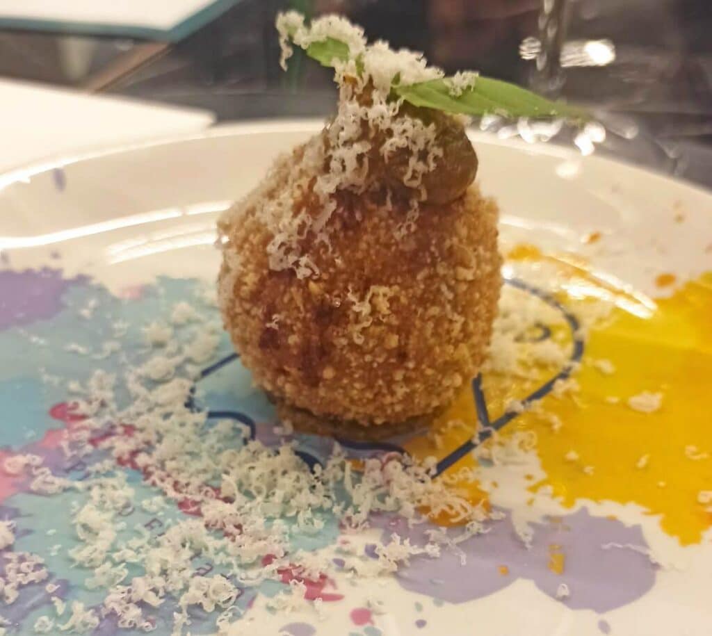 Opera di Melania sono anche i fritti preparati giornalmente, come l’arancino alla parmigiana – riso carnaroli, ragù di San Marzano dop e melanzane alla parmigiana – piccola sfera croccante all’esterno dal cuore cremoso e aromatico, amuse-bouche che apre la nostra degustazione.
