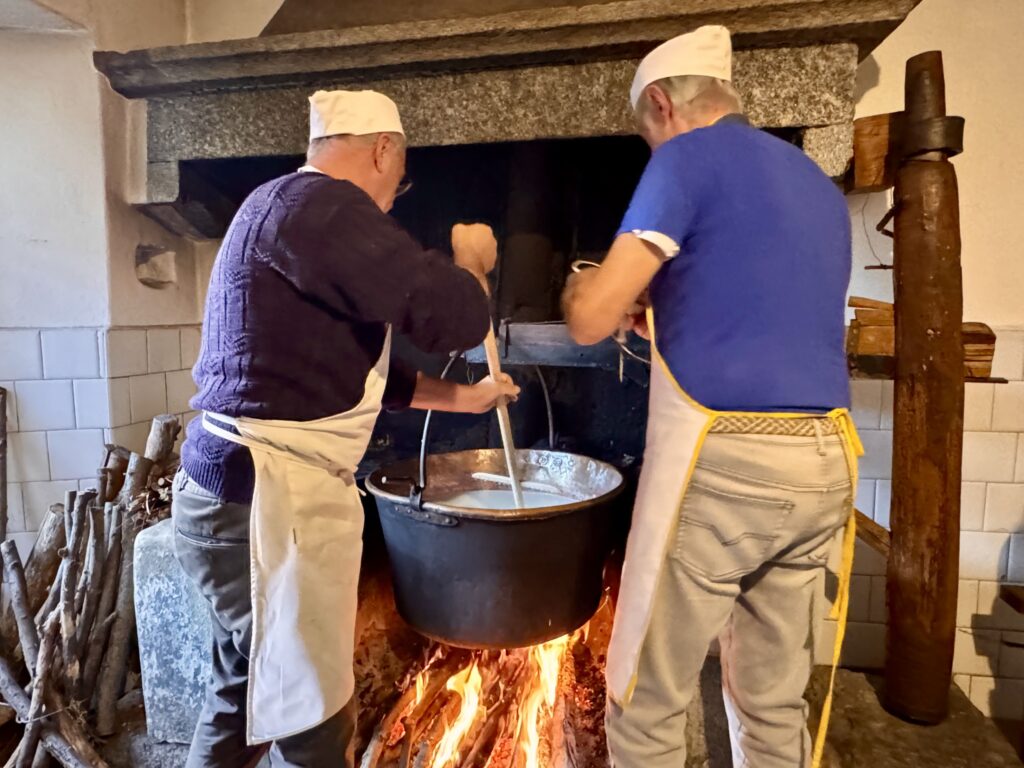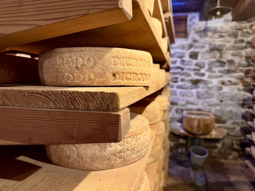 La visita all’Antica Latteria di Oira: si entra in un edificio di pietra, fresco anche d’estate. Le pareti raccontano la storia dei pastori della valle, dei pascoli alti, delle vacche allevate chiuse nel silenzio di boschi e alpeggi. La cagliata viene rotta con lo spino, piccoli granuli che scivolano sul fondo e quando il casaro solleva la cagliata con la tela e la deposita nelle forme, nasce il formaggio. È un momento semplice e bellissimo, è il passaggio dalla materia al prodotto, dal latte all’identità culinaria della valle.