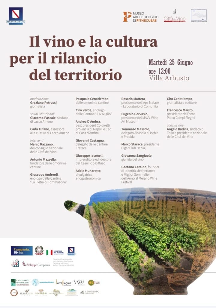 A tal fine, con la moderazione del giornalista Graziano Petrucci, parteciperanno Giacomo Pascale, sindaco di Lacco Ameno, e Carla Tufano, assessore alla cultura di Lacco Ameno, per i saluti istituzionali. Interverrà Marco Razzano, del consiglio nazionale delle Città del Vino, Antonio Mazzella, fondatore delle omonime cantine, Giuseppe Andreoli, enologo della Cantina “La Pietra di Tommasone”, Pasquale Cenatiempo, delle omonime cantine, Ciro Verde, enologo delle Cantina “Il IV Miglio”,Andrea D’Ambra, past president Coldiretti provincia di Napoli e Ceo di Casa d’Ambra, Giovanni Castagna, delegato delle Cantine Crateca, Giuseppe Iaconelli, imprenditore ed ideatore del Caseificio Diffuso, Adele Munaretto, divulgatrice enogastronomica, Rosario Mattera, presidente dell’Aps Malazè – Laboratorio di Comunità, Eugenio Gervasio, presidente del MAVV-Wine Art Museum,Tommaso Mascolo, delegato Ais Isola di Ischia e Procida, Marco Starace, presidente Cigar Club Ischia, Giovanna Sangiuolo, giurista del vino, Gaetano Cataldo, founder di Identità Mediterranea e miglior sommelier dell’anno al Merano Wine Festival, Ciro Cenatiempo, giornalista e scrittore e Francesco Maisto, presidente dell’ente Parco Campi Flegrei. Concluderà Angelo Radica, sindaco di Tollo e presidente nazionale delle Città del Vino.