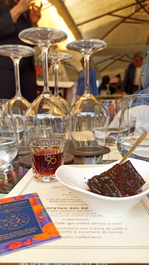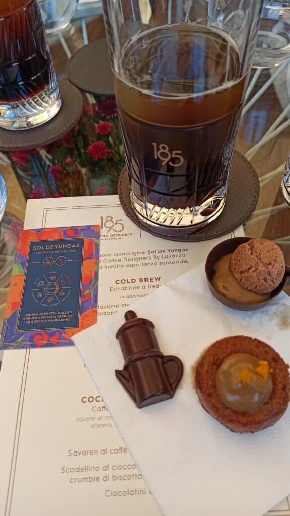 Il percorso è terminato con una nuova versione di Sol de Yungas, e un abbinamento indiscutibilmente più canonico. Per il cocktail Sol de Yungas, il caffè è stato messo in infusione per una notte. Eliminata la parte solida, il liquido ottenuto è stato miscelato con liquore al caffè, rum scuro invecchiato, sciroppo d’acero, gocce di bitter al cioccolato. L’abbinamento con una savarin con crema al caffè e zest di mandarino, scodellino al cioccolato con crema al caffè e amaretto, cioccolatino caffettiera ha incontrato i gusti dei palati più tradizionali.