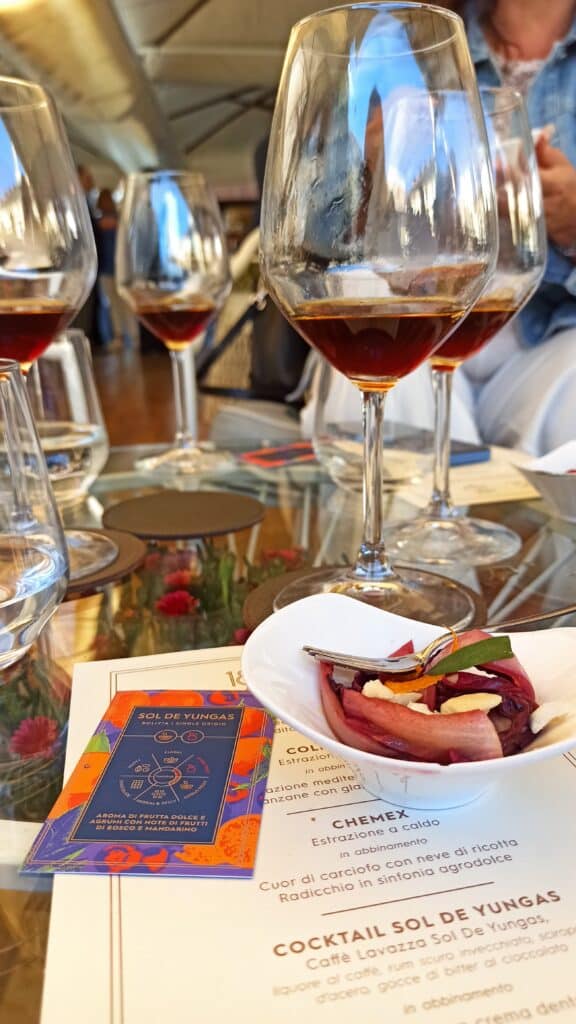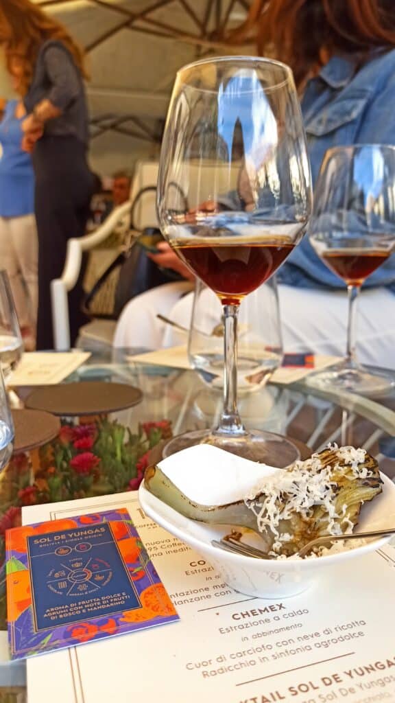 La prima proposta di food – Tentazione mediterranea a base di melanzane con glassa al cioccolato – ha affiancato Sol de Yungas ottenuto in cold brew, da estrazione a freddo.