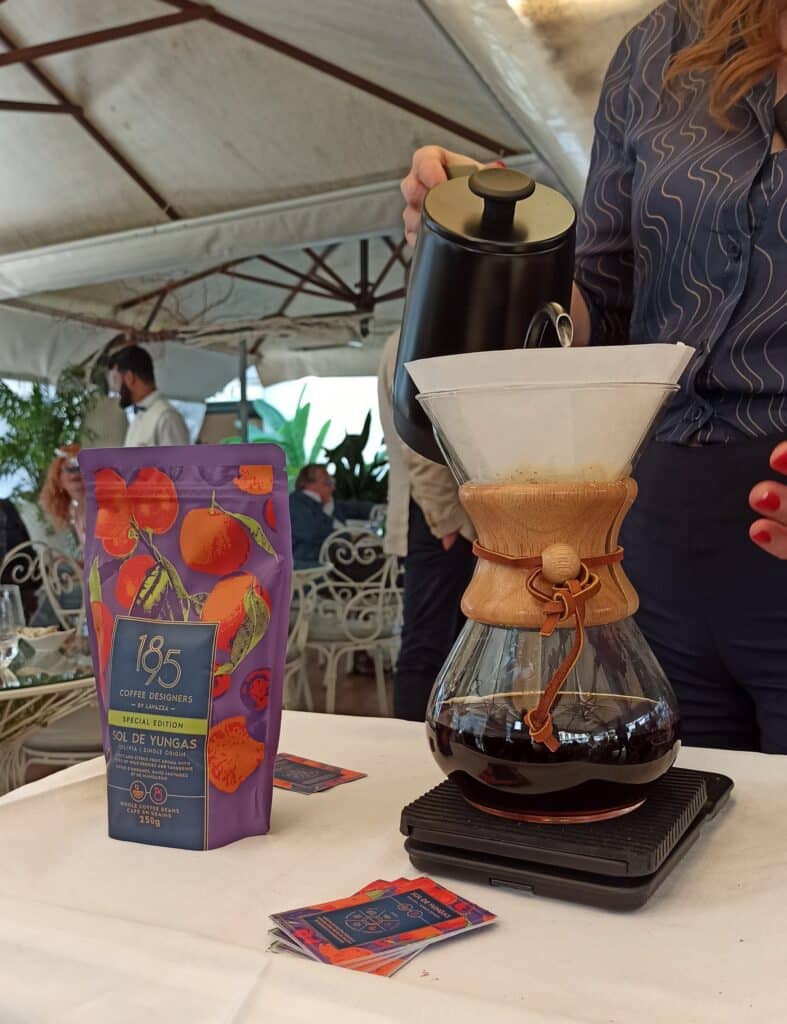 Anche gli abbinamenti con il cibo non sono tra quelli canonici. Il caffè, ha spiegato Tommaso Luongo, non solo è privo di alcol ma presenta delle componenti aromatiche che gli permettono di essere abbinato per affinità a cibi che spesso non trovano un pairing ideale nel vino, come il carciofo, il radicchio o l’aceto. Anche il caffè, infatti, può essere descritto attraverso una ruota di oltre 1500 profili aromatici, che per immediatezza e comodità Lavazza ha ristretto a sei macro-famiglie: frutti dolci, agrumi, erbe e spezie, cioccolato, frutta secca, fiori.
