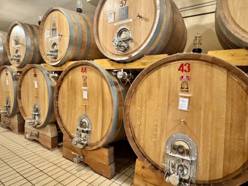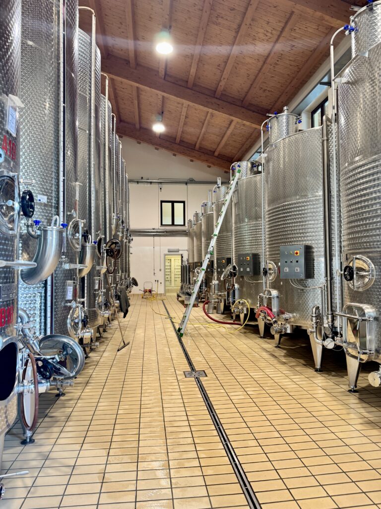 All’interno della cantina, l’atmosfera cambia ritmo. L’acciaio lucido e i touchscreen che controllano le fermentazioni convivono con il legno delle botti dove maturano i rossi e l’unico bianco, il Trebbiano Spoletino, che affina un anno in rovere austriaco e due in bottiglia.
