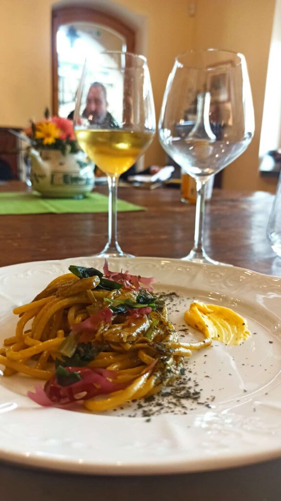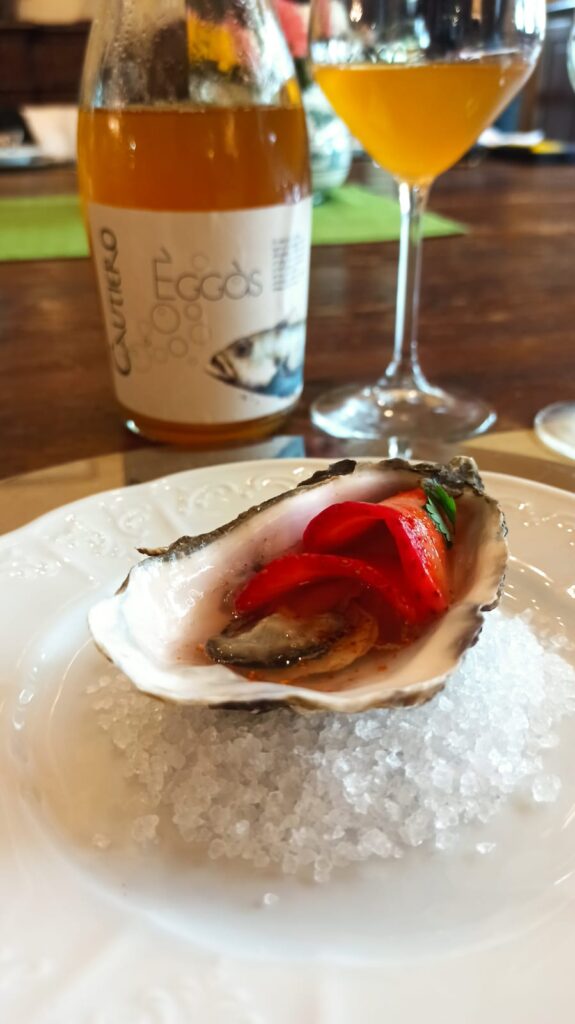 Èggàs Falanghina frizzante IGT Campania 2022 ha accompagnato i primi due piatti. Vendemmia 2022 per l’80% Falanghina e il resto suddiviso tra Fiano e Greco, fa macerazione sulle bucce per quattro giorni e rifermenta in bottiglia. Non chiarificato per scelta, ha sentori di mela verde e biancospino, dal sorso fresco e intrigante con chiusura amaricante tipica della mandorla fresca, che ben si abbina alle prime due proposte a tavola.