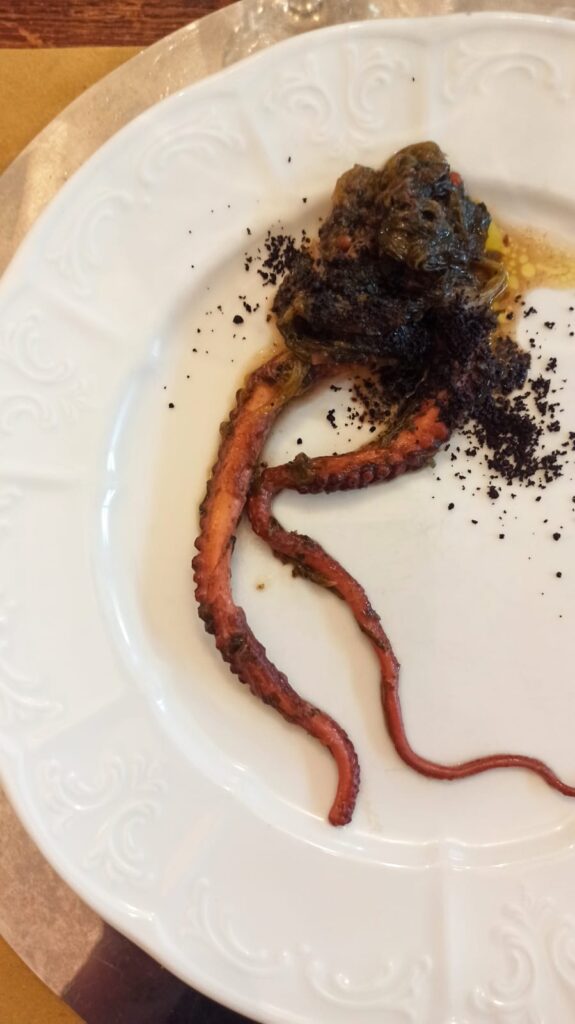 La polpessa alghe e scarole è l’ultima portata prima della chiusura, ancora una volta tributo al mare elevato all’ennesima potenza, abbinata con Piedirosso IGT Campania 2020, dalla beva snella e non impegnativa. Fulvio ci racconta delle difficoltà – ben note ai viticoltori campani – sia nella coltivazione che nella vinificazione del Piedirosso. L’annata che degustiamo è ancora completamente fermentata e affinata in acciaio, ma Fulvio anticipa per i prossimi millesimi l’utilizzo di anfora marchio Tava.