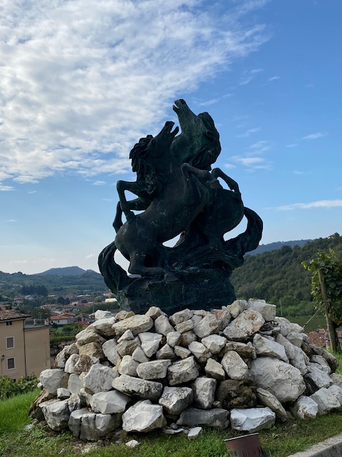 Subito all’esterno, nel piazzale della cantina, ci accolgono le prime opere: la scultura di bronzo “Cavalli Innamorati” di Aligi Sassu in posizione dominante di tutta la valle e dei vigneti, questa celebra la bellezza della natura e rappresenta l’amore per questo territorio; il “Moby Dick” di Mattia Motta, la balena inabissata, arpionata da Achab e mai conquistata è il simbolo del sogno irraggiungibile: quello della sfida costante per creare un vino perfetto.