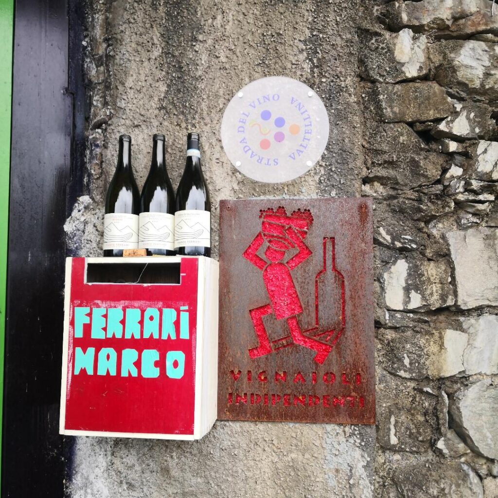 A fianco, due botti una sopra l’altra, a definire compiutamente l’entità del luogo, e appesa vicino a un caratteristico muro di pietre, una vecchia targa in metallo con il logo dell’Alfa Romeo. Sull’uscio, assieme al papà che appena mi presento saluta me e mia moglie per poi dileguarsi, ci attende Marco Ferrari, produttore di Nebbiolo delle Alpi come si usa chiamare qui il nobile vitigno per distinguerlo dal piemontese. Un’altra targa all’ingresso è quella con il logo dei Vignaioli Indipendenti.