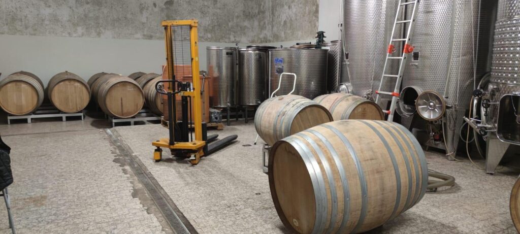 Dicevamo che la vinificazione avviene in un locale (mi è venuto spontaneo pensare ai vin de garage) che in precedenza ospitava un laboratorio di formaggi diviso in stanze, dove per i primi due anni, essendo un posto nuovo per questo genere di attività, per la fermentazione si è dovuto procedere all’inoculo con pied de cuve, ma a partire dal 2021 questa avviene spontaneamente, testimoniata dalle pareti di calce colorate da microrganismi del nuovo genius loci.