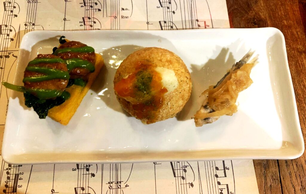 alici ‘mbuttunate in saor accompagnate dal Valpolicella Classico Doc “Possessioni” 2021 di Serego Alighieri, classico incontro di uve Corvina, Rondinella e Molinara (clone Serego Alighieri da una vigna a piede franco), dai tannini morbidi e dall’ottima bevibilità fruttata.