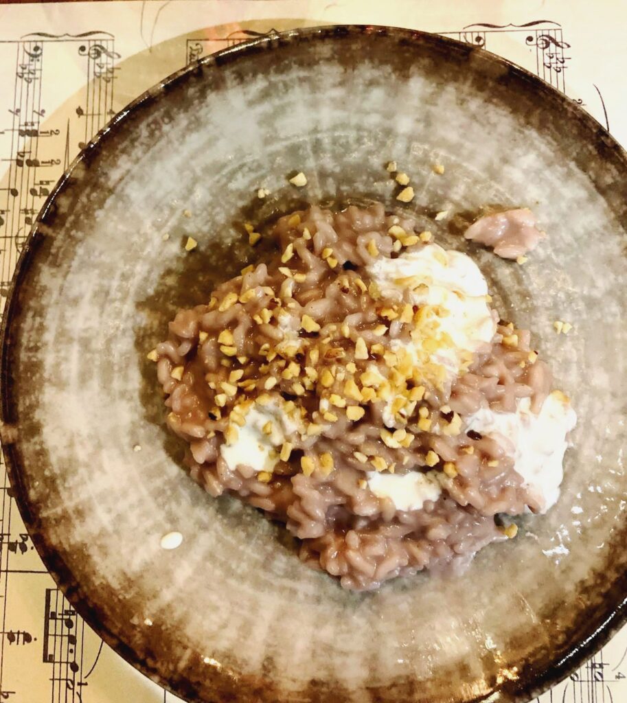 Prima del gran finale non poteva mancare il classico Risotto all’Amarone, eseguito alla perfezione con l’aggiunta di yogurt di bufala e nocciole di Giffoni. Qui la maggiore età dell’Amarone della Valpolicella Classico Docg “Vaio Amaron” 2016 di Serego Alighieri, con le sue nuance da confettura di frutti di bosco e una speziatura completa tra pepe nero e cannella, ottiene il massimo consenso dei presenti.