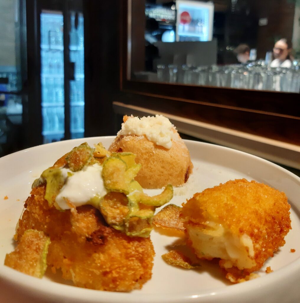 L’ampia degustazione delle proposte di Maturazioni in un momento conviviale organizzato dalla giornalista Francesca Panico, ha preso avvio dai fritti fatti in casa. Il classico crocchè alla napoletana, la gustosa frittatina di pasta con besciamella e fonduta di parmigiano e una rivisitazione della Nerano con stracciata di bufala e chips di zucchine. Croccantezza e realizzazione magistrale della frittura asciutta e compatta, tra le migliori da segnalare nei locali della Campania.