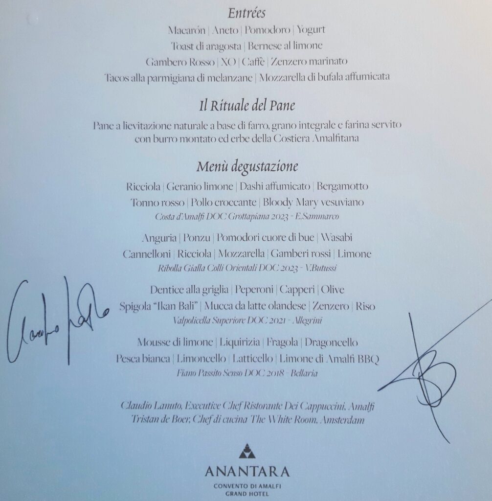 Sono felice e onorato di questa collaborazione“. Racconta l’Executive Chef Claudio Lanuto.È un affascinante incontro tra Amalfi e Amsterdam, dove due tradizioni così distinte si fondono in un’armonia perfetta. Attraverso l’uso di ingredienti comuni, ma con interpretazioni diverse, rispettiamo e valorizziamo la stagionalità di ogni prodotto. Auspico sinceramente che questa collaborazione sia solo l’inizio di una lunga serie di eventi che celebrano la diversità e la ricchezza delle nostre tradizioni gastronomiche.
