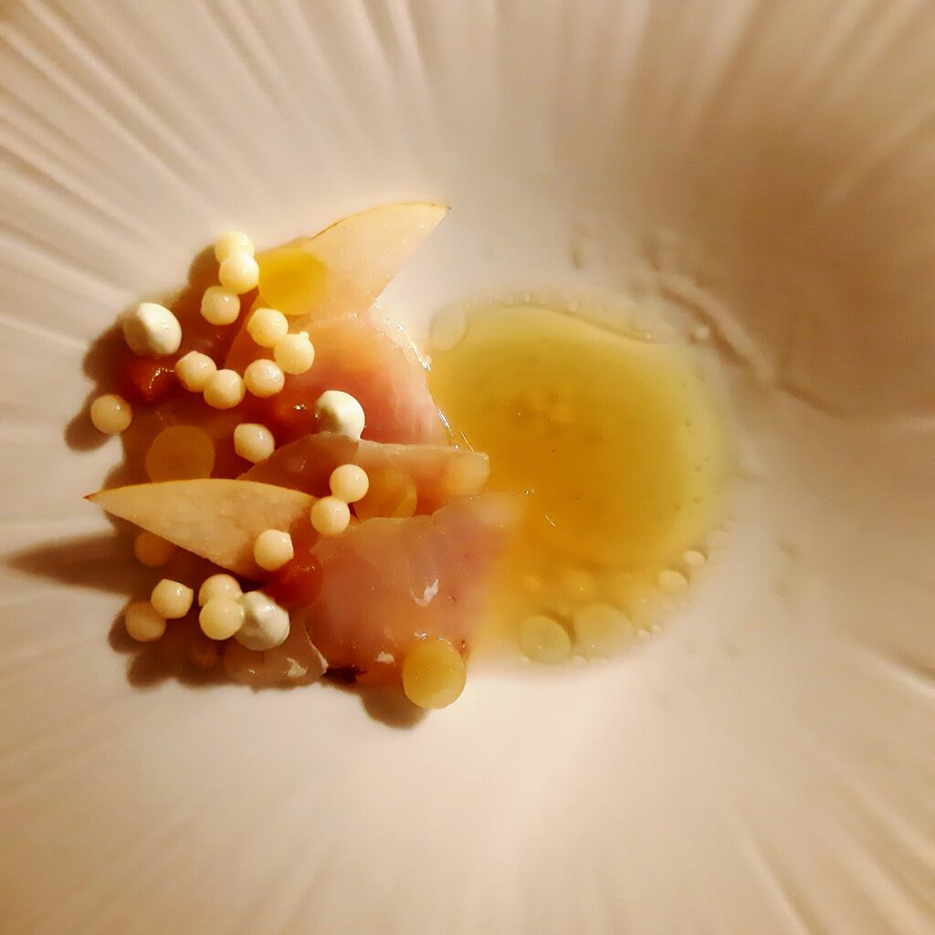 Ed a proposito di piatti, merita una degna menzione l’entrée proposto da Tristan a base di gambero rosso, caffè e zenzero marinato, così come la ricciola con geranio limone, dashi affumicato e bergamotto, di gran lunga il piatto migliore della serata.