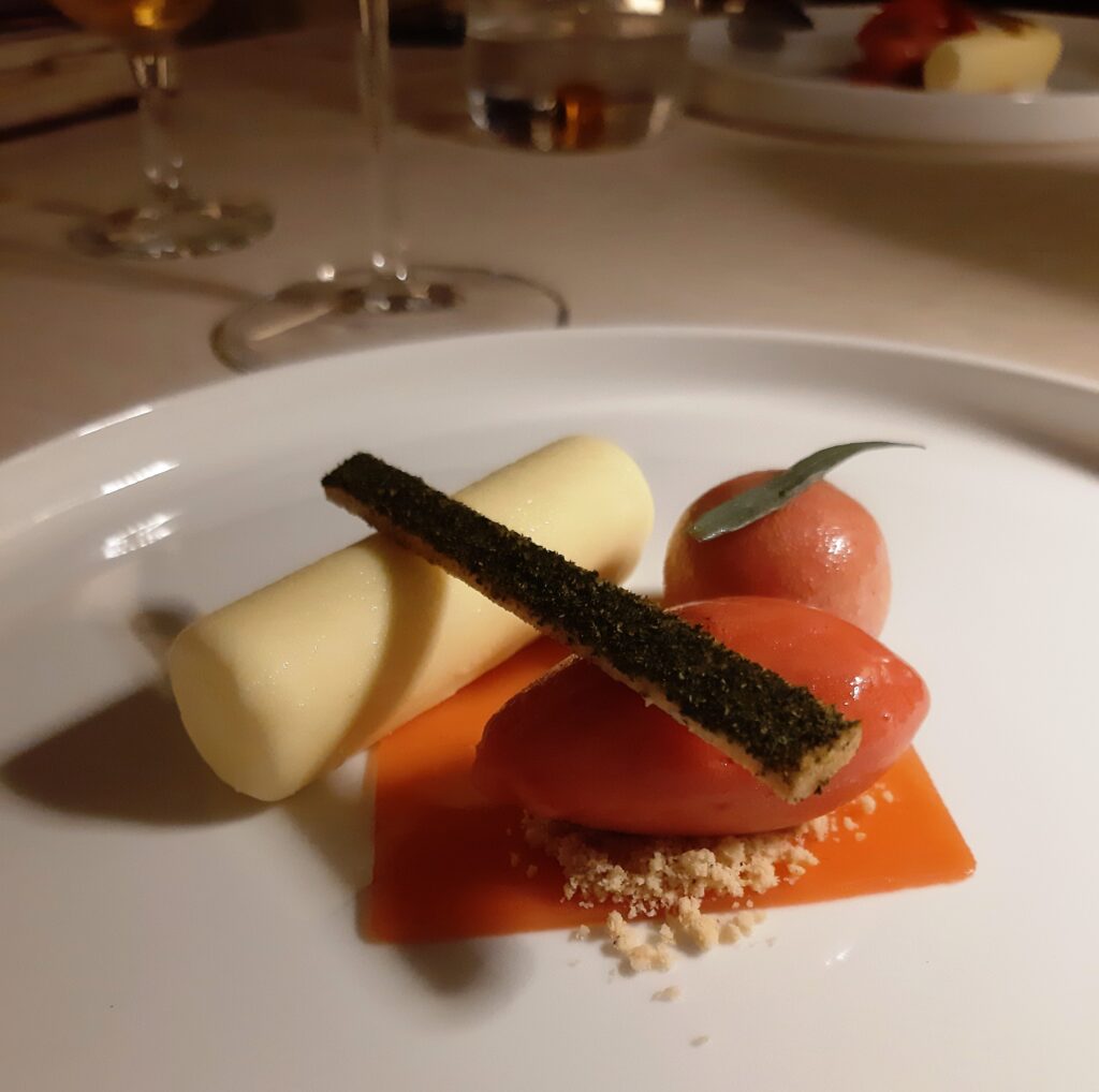 La nouvelle vague dei dessert richiede ormai sempre maggior contrasto tra sensazioni dolci e acide o astringenti; l’opinione da critico del sottoscritto, che nulla aggiunge alla magnifica serata evento, è che tutto va bene a patto che avvenga cum grano salis.