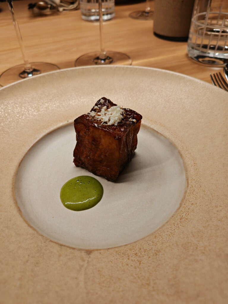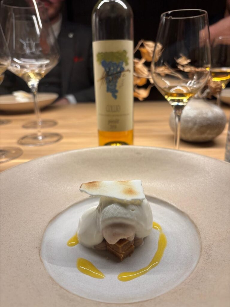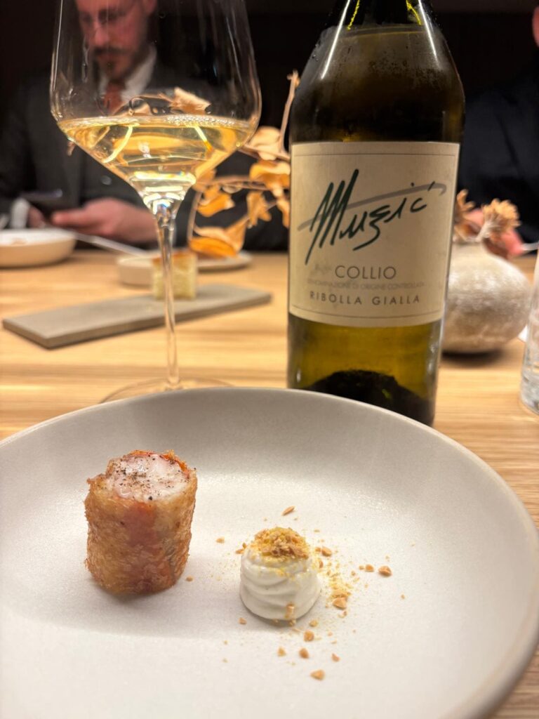 • Triglia di Scoglio, pepe Timut e mandorla — Splendido il ricordo delle fritture di paranza fronte mare, un assaggio carnoso,dai contorni crunchy, dal tocco pepato e quel finale lungo e umami portato dalla mandorla tostata che crea dipendenza. Qui la Ribolla Gialla Muzic ha trovato il suo terreno ideale: freschezza e acidità hanno bilanciato la grassezza del pesce, con ritorni agrumati che hanno accompagnato la nota aromatica del piatto.