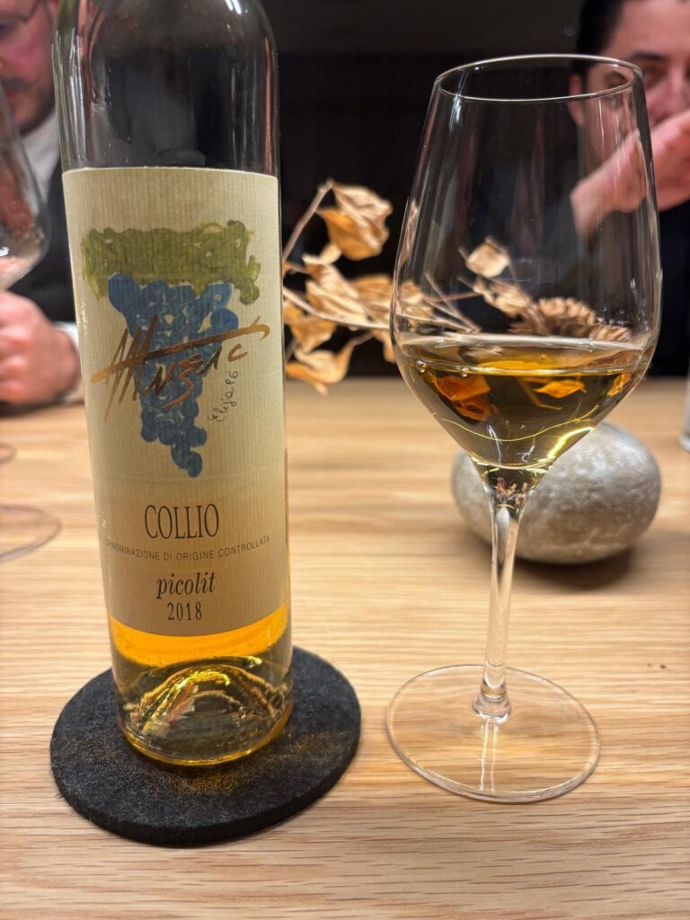 Il primo calice è una Ribolla Gialla 2024 in versione ferma. Premesso che l’apertura con bolla non è una convenzione ma una scelta largamente diffusa (a volte scientemente) i Muzic non spumantizzano, non per intolleranza verso le bolle ma per una scelta dettata dall’interpretazione del vitigno che il loro territorio permette. Il clima nella località Bivio di San Floriano del Collio è Mediterraneo, accogliente, e la Ribolla che ama questo clima qui esprime il suo varietale fruttato agrumato in maniera importante, abbinato a una piacevole mineralità e salinità figli del patrimonio geologico. Un vino schietto, che soddisfa fin dal primo sguardo dai contorni dorati, coinvolge con i suoi toni di pompelmo e la freschezza che insieme alla dotazione salina invogliano tantissimo la beva.