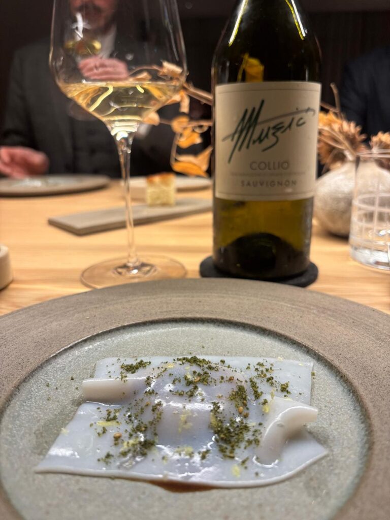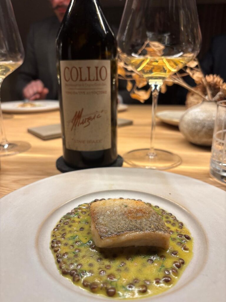 La serata si è svolta da Abba, ristorante milanese guidato da Fabio Abbattista, dalle radici pugliesi e consolidate esperienze internazionali, una mano delicata, saporita ed eccellente per una cucina dal passo moderno. Il locale, si trova nel Certosa District, una zona rinnovata di Milano, in grande fermento, è un open space in un contesto industriale ristrutturato, e ha offerto un palcoscenico ideale: piatti pensati per esaltare i vini Muzic, con un approccio che privilegia leggerezza, contrasti e precisione tecnica.
