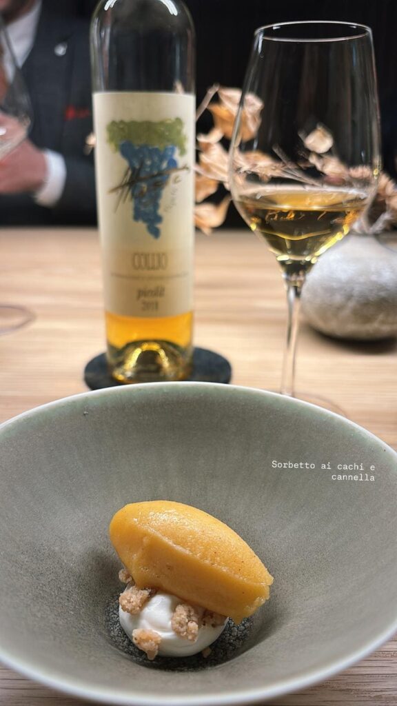 • Sorbetto ai cachi e cannella – Un duetto perfetto col picolit, la componente grassa lenisce l’effetto termico del sorbetto e lascia un tema fruttato giallo perfettamente in armonia col vino.