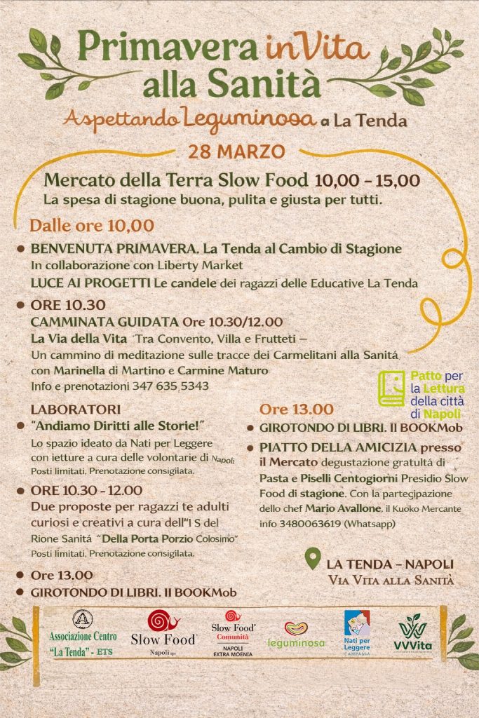 La prima edizione, a La Tenda, il prossimo sabato 28 marzo, di “Primavera inVita alla Sanità” si inserisce in Aspettando Leguminosa di Slow Food 2026, forte della felice esperienza di questi mesi dei Piatti della Amicizia con i Fagioli Dente di Morto, I Ceci di Teano e, per il prossimo 28 marzo, i Piselli Centogiorni. Tutti Presidi Slow Food e tutti semi che saranno protagonisti, appunto a Leguminosa in programma a Napoli, alla Stazione Marittima, l’11 e 12 aprile.