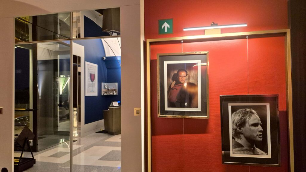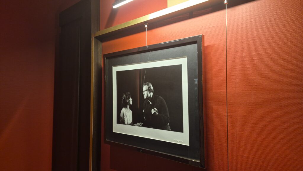 Nel percorso espositivo si alternano ritratti in bianco e nero di grande eleganza formale, scatti a colori più informali e immagini che restituiscono l’attore in diverse dimensioni: sorridente davanti all’obiettivo, spettinato dal vento, oppure colto in momenti di pausa mentre dialoga con i membri della troupe o osserva l’ambiente circostante. Accanto a queste fotografie compaiono anche immagini di scena, tra cui quelle realizzate durante le riprese del western One-Eyed Jacks, unico film diretto dallo stesso Marlon Brando nel 1961.