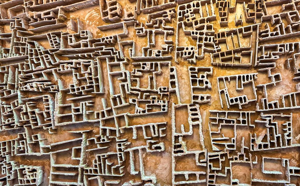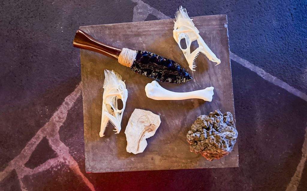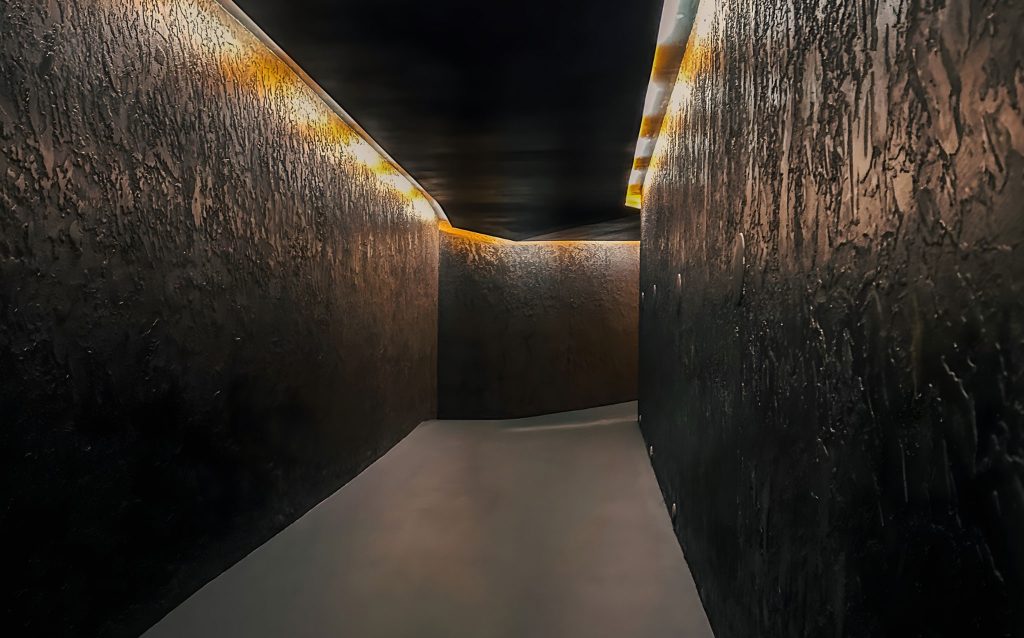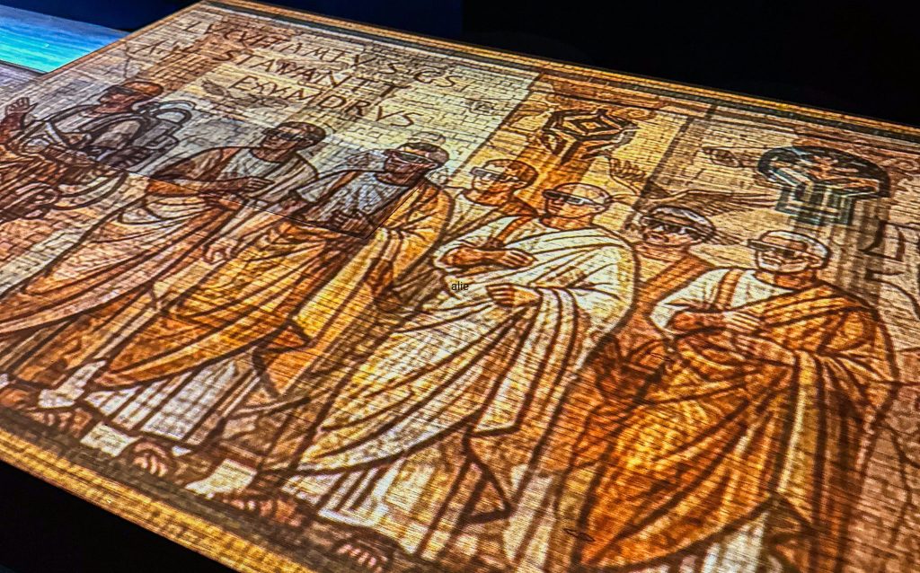 Si comincia proprio dalla preistoria con un tunnel interattivo di lava stratificata e sonorità selvatiche fino a giungere al salottino denominato “Thermopolium” in stile cyberpunk, con atmosfere distopiche e fantascientifiche dei libri di Azimov e Lem o delle sceneggiature alla Blade Runner: immagini di macchine volanti, pioggia e automi in movimento. Ai tavoli invece i calchi fossili marini, presenza “vivente” della fertilità delle terre del Sele, ai confini con la Lucania.