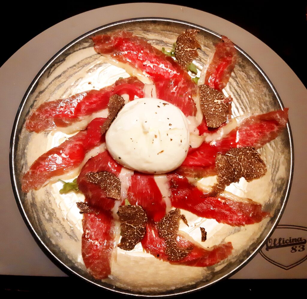 La picanha di Swamy, lavorata e frollata dallo staff a partire dalla mezzena, cosa rara solo in carta alle migliori steak house, ha subito un’affumicatura ai trucioli di Jack Daniel’s Tennessee Whiskey. Un carpaccio sottile e saporito con 3 diverse varietà di pepe in grani, burrata e scaglie di tartufo nero.