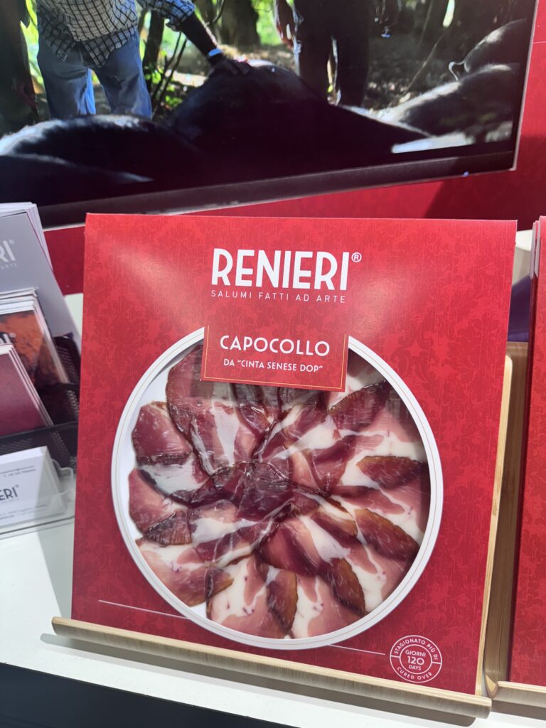 Renieri salumi di Cinta Senese- Poggibonsi (Siena) – prosciutto di cinta senese stagionato almeno 24 mesi. La razza Cinta Senese ha sapore e caratteristiche uniche: sapidità e succulenza che la rende più gustosa. Il grasso è meno consistente, più fluido e molto gradevole al palato con ottime caratteristiche aromatiche. www.renieri.net