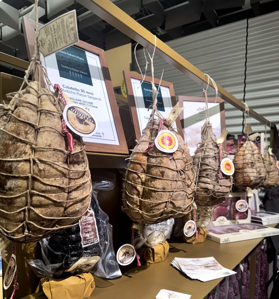 Antica Corte Pallavicina dei Fratelli Spigaroli dal 1882 – da Polesine Zibello (PR) Emilia Romagna – Culatello di Zibello stagionato con un minimo di 10 mesi fino a 36 mesi, nelle cantine del palazzo trecentesco, un luogo ricco di storia, ove stagionavano i culatelli che un tempo venivano inviati ai duchi di Milano (gli Sforza), per i banchetti al Castello Sforzesco o come dono prezioso alla più alta nobiltà. www.fratellispigaroli.it
