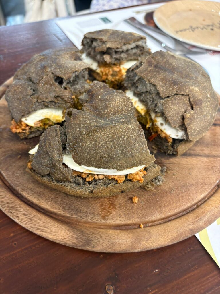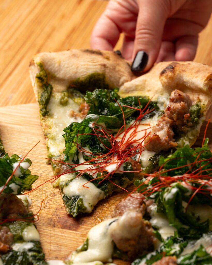 Non manca l’estro e il coraggio nel diversificare le preparazioni in base alle farine come nella Luna Bruciata da grano arso, croccante e scura, servita con carne macinata, mozzarella di bufala e peperoncini verdi di fiume.