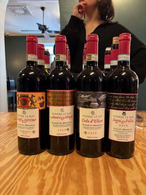 - Brunello di Montalcino DOCG 2020. Un Sangiovese in purezza che esprime forza e fascino. Rosso rubino, con riflessi granati. Profumi eleganti e complessi dove ritroviamo sentori di frutti di bosco maturi e di anice. I tannini sono vellutati. Dopo mesi che passa in legno rimane fresco, profumato, fruttato, non soffre l’aggressione del legno.