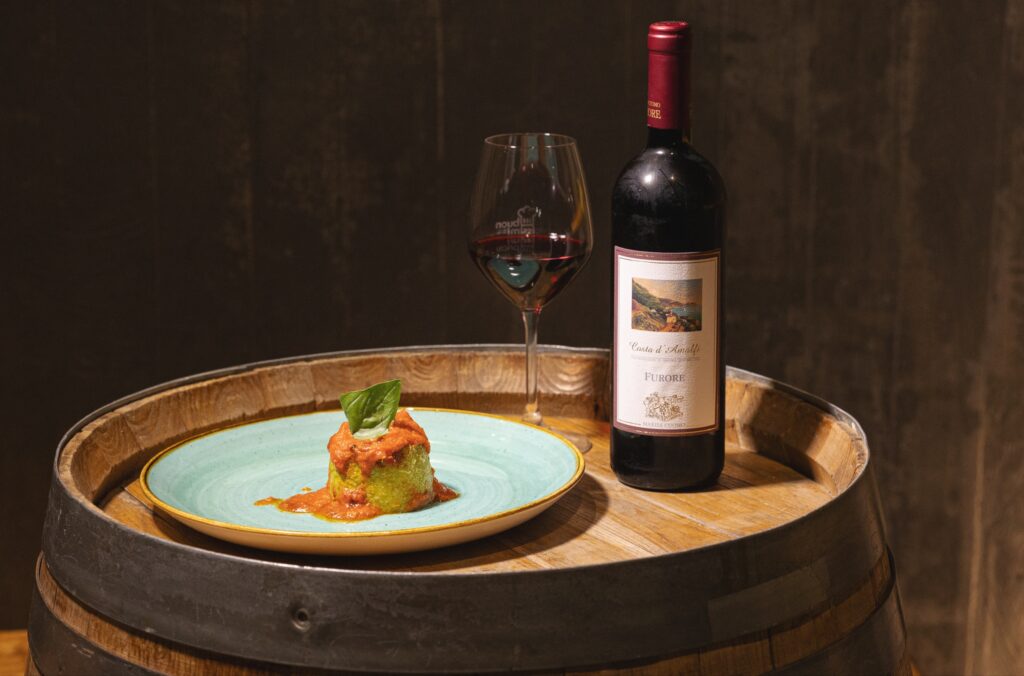 Prima del dolce finale il Sarchiapone di Atrani, salume tipico farcito con la pezzentella, salsiccia artigianale dal carattere deciso e autentico. A bilanciare la struttura imponente di questo piatto, il Furore Rosso Costa d’Amalfi DOC 2024, un uvaggio di Aglianico, Piedirosso e Tintore di Tramonti, maturato in legno, che offerto nel bicchiere morbidezza tannica e un bouquet complesso.
