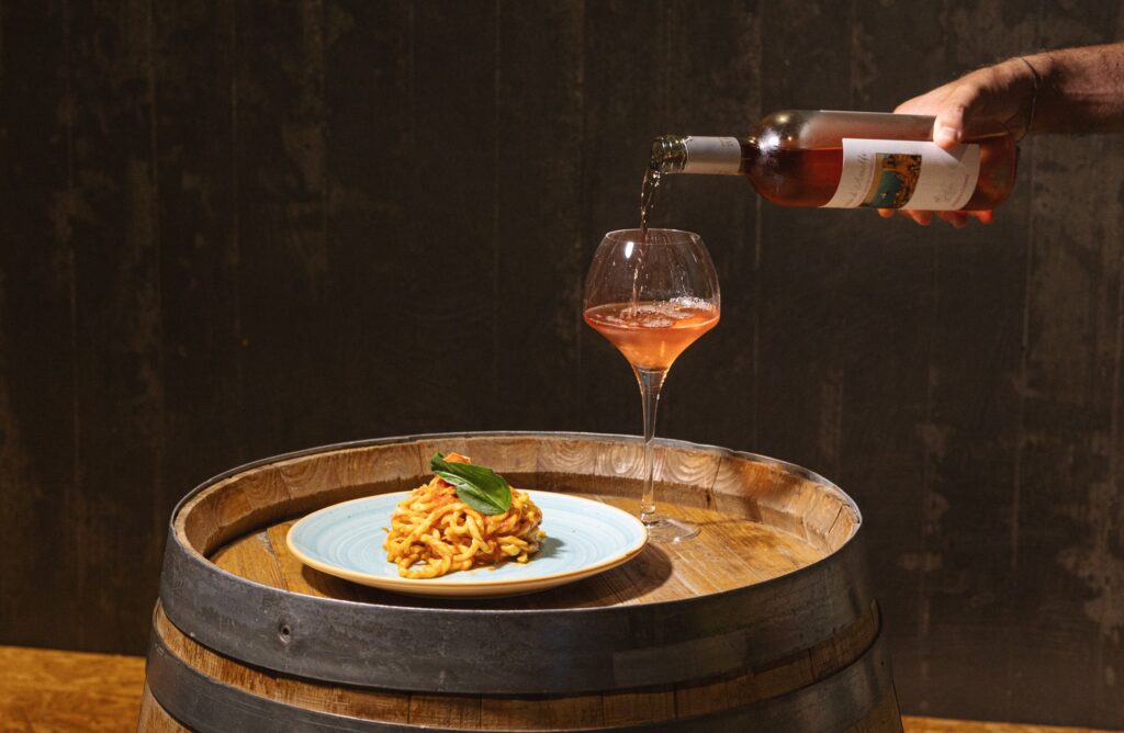 Il primo piatto – “Scarpariello a Mare” – si è presentato come un’opera d’arte mediterranea, con Fusillo Sangiliano, Pomodorino di Corbara, acciughe di Cetara, basilico fresco e scorzetta di limone sfusato di Amalfi, abbinato al Rosato Costa d’Amalfi DOC 2024, blend di Aglianico, Piedirosso e Tintore di Tramonti, che ha accompagnato la sapidità del piatto e le note agrumate senza mai sovrastare le componenti aromatiche.