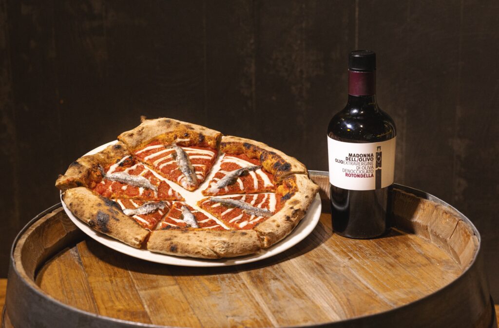 Ma il vero fulcro della serata è stato il trittico di pizze gourmet, ciascuna una narrazione sensoriale, un’ode alla terra e al mare del territorio campano. Il “Padellino Lattaro” ha mescolato farine selezionate con formaggi eccelsi quali Provolone del Monaco, Caciotta di Capra e il Fiordilatte di Agerola, arricchito dal Pomodorino di Corbara semi dry e da un pesto aromatico che esaltava maggiorana, basilico e timo limonato.