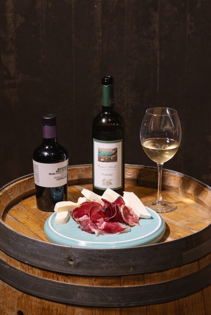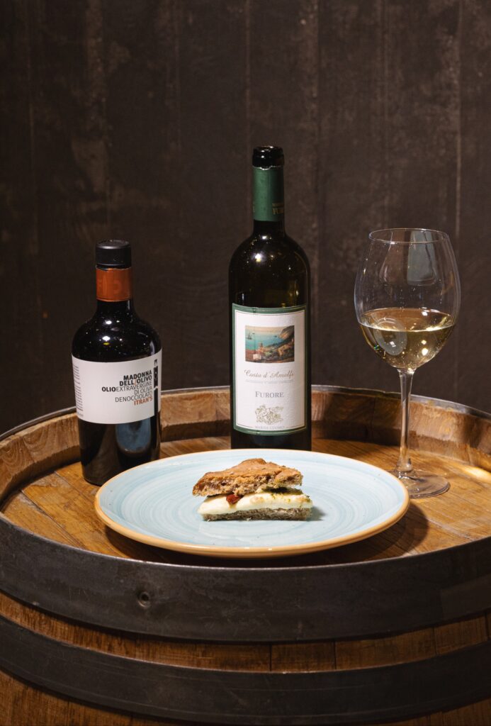 Il viaggio virtuale è iniziato con l’eleganza fragrante del Furore Bianco Costa d’Amalfi DOC 2024, da Biancolella e Falanghina, capace di esaltare e bilanciare con finezza ogni piatto. Un vino dal carattere austero e raffinato, ambasciatore perfetto delle sue terre d’origine.