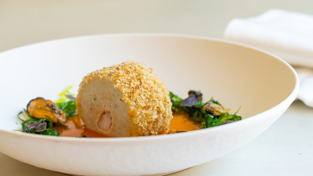 Due ricette, due modi opposti di intendere il pescato del Cilento. Nella prima, la terrina di branzino pescato a lenza con zuppetta di crostacei, frutti di mare e alga wakame, rientra il concetto di fusion, di contaminazione tra materie prime d’estrazione eterogenea, legate dal fil rouge del ritorno al mare. L’idea di spingere quasi sui ricordi d’infanzia, quando preparare le terrine (di carne) era un momento di convivialità familiare nei momenti di festa.