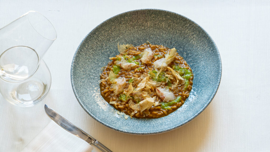 Apparentemente più classica e tradizionale la ricetta del risotto con gambero rosso del Cilento, crema di peperoncino di fiume, yuzu e katsuobushi. Le sensazioni agrumate e sapide degli ingredienti orientali in realtà richiamano molto la nostra mentalità di mantecatura del riso, che deve fungere da perfetto amalgama tra le varie componenti del piatto.