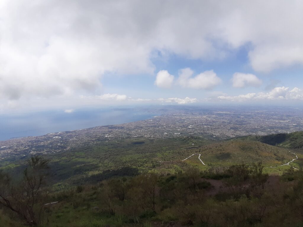 Non è mare, non è pura montagna, come vissuta nell’immaginario collettivo. O meglio, il Vesuvio possiede i caratteri di entrambi, con una vista spettacolare di tutto il Golfo di Napoli in lontananza, partendo dalle propaggini di Pompei e Castellammare di Stabia, fin quasi – a perdita d’occhio – direttamente a Posillipo. E poi l’altitudine, il vento forte che sferza ad ogni momento della giornata e gli sbuffi sulfurei, ancora presenti, che ricordano la sua attività silente ma presente.
